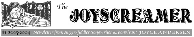 On that note....I wish you all a peaceful 2004. I am busy finishing up a whole bunch of new songs and I look forward to having two new CDs to share with you before the year is out, one with Harvey Reid and another solo release. I will keep you posted on these new releases as well as when I'm playing in your area if you let me know how. Please sign up on the mailing list. I won't share your information with anyone buy my husband, and he's the same way. Now go out and support live music! Or support independent art right here on this website and pick up a CD or two for yourself or a friend.